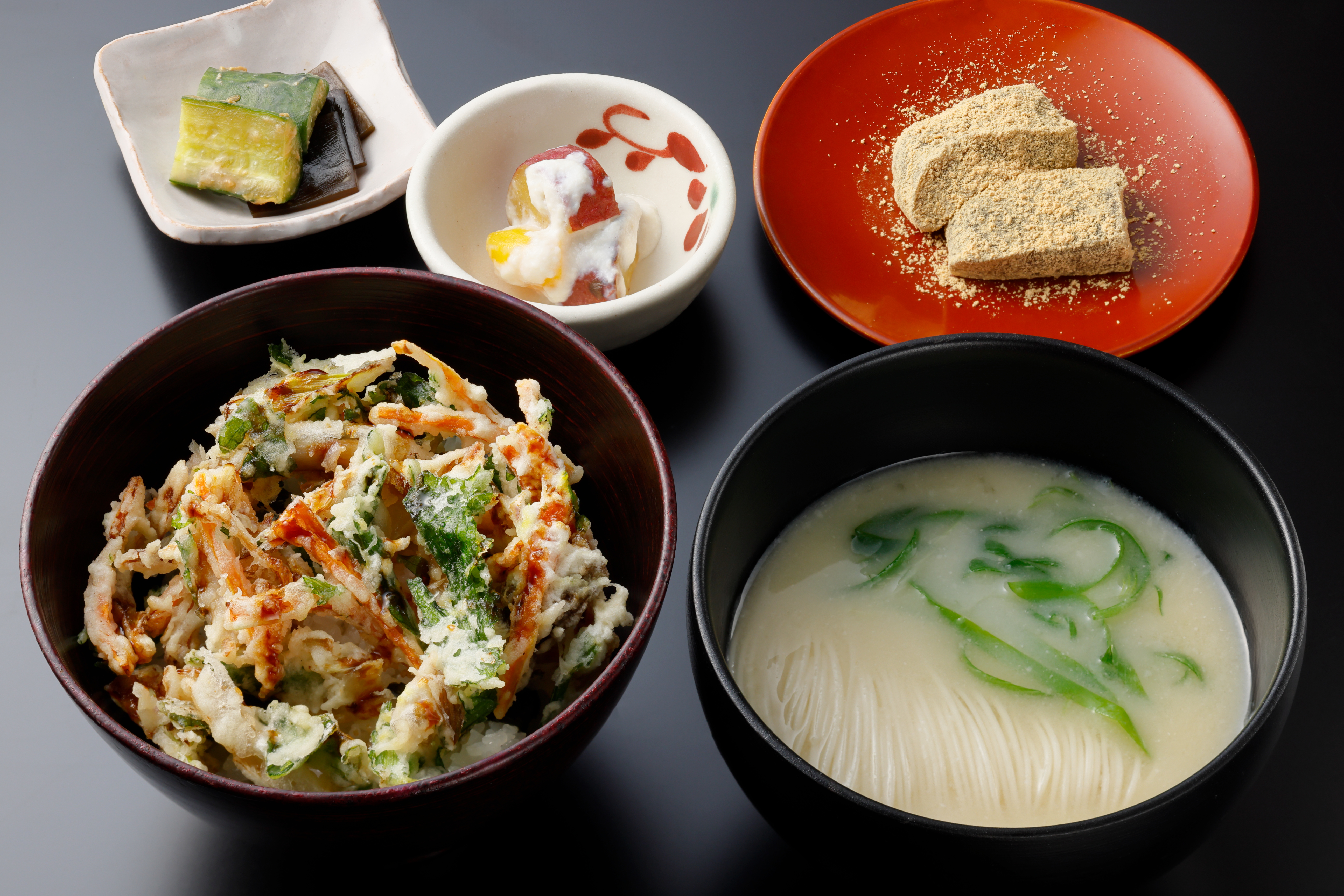 季節野菜のかき揚げ丼と白味噌のお出汁の煮麺のセットです。